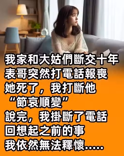 我家和大姑們斷交十年 表哥突然打電話報喪 她死了,我打斷他 「節哀順變」 說完,我掛斷了電話 回想起之前的事 我依然無法釋懷.....
