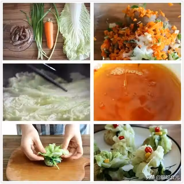 6、燙好的白菜葉放在案板上,放上一些蝦肉餡,拿起白菜葉邊緣,往中間向上提著包起來,然後用韭菜葉在上面纏一下,系一個好看的結。