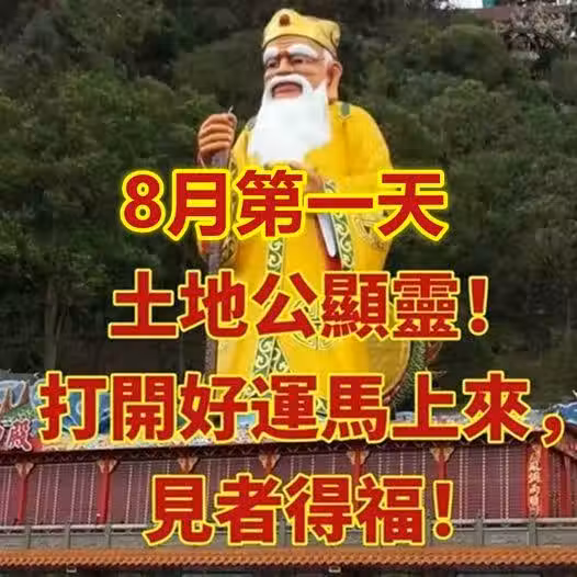 8月第一天,土地公顯靈!打開好運馬上來,見者得福!下半年身體安康發大財!真的靈! 土地公會留在人間三天,這三天大家別忘了接土地公,我接了; 土地公說了: