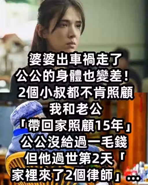 婆婆出交通事故走了公公的身體也變差! 2個小叔都不肯照顧,我和老公「帶回家照顧15年」公公沒給過一毛錢 但他過世第2天「家裡來了2個律師!」…