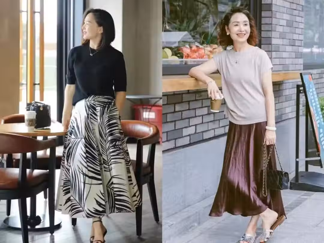 五六十歲的女人穿T恤時,儘量不要搭配短褲、牛仔褲,換成這些會更洋氣高級