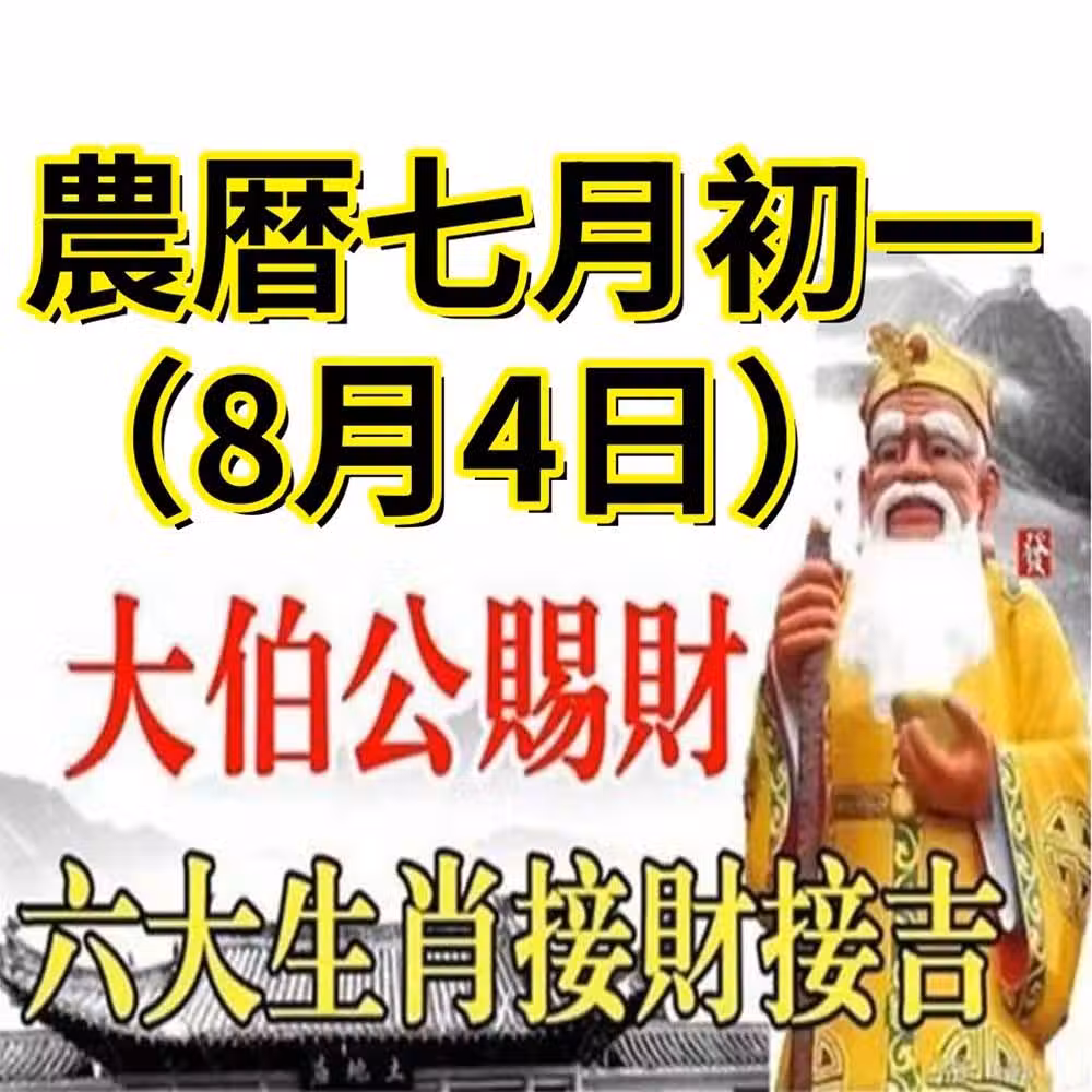 農暦七月初一(8月4日)大伯公賜財,六大生肖接財接吉!