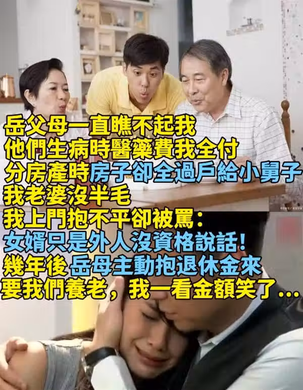 岳父母一直瞧不起我...他們生病時醫藥費我全付! 分房產時「房子卻全過戶給小舅子」我老婆卻沒半毛...我上門抱不平卻被罵:「女婿只是外人沒資格說話!」幾年後「岳母主動抱退休金來」要我們養老,我一看金額笑了...
