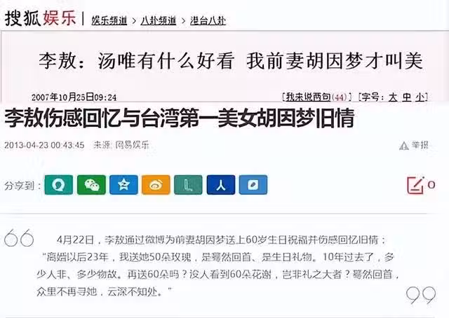 2013年,胡因夢六十歲生日,李敖在微博上送上了祝福。