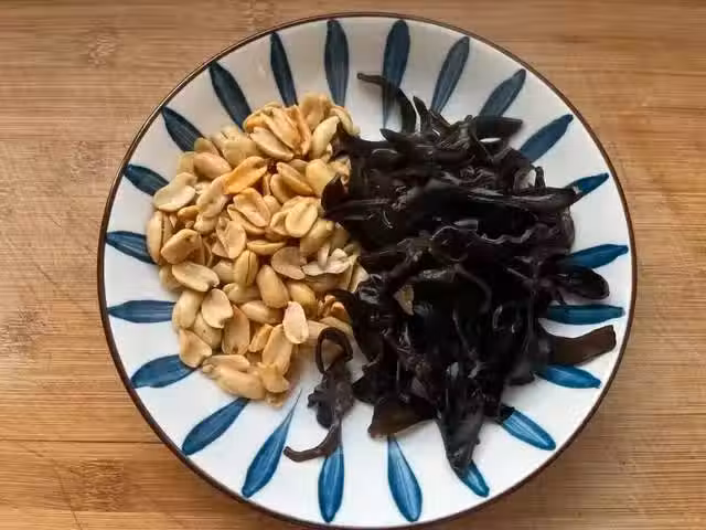 3、切好的洋蔥段、紅椒段、木耳、花生米都都放在一塊,喜歡吃香菜的可以來點香菜,接下來就是放調料品,放點白糖提鮮、2勺陳醋、1勺蚝油、少許味極鮮、香油和鹽,雙手戴上一次性手套充分的抓拌均勻,讓所有食材入味,口感更好吃些。