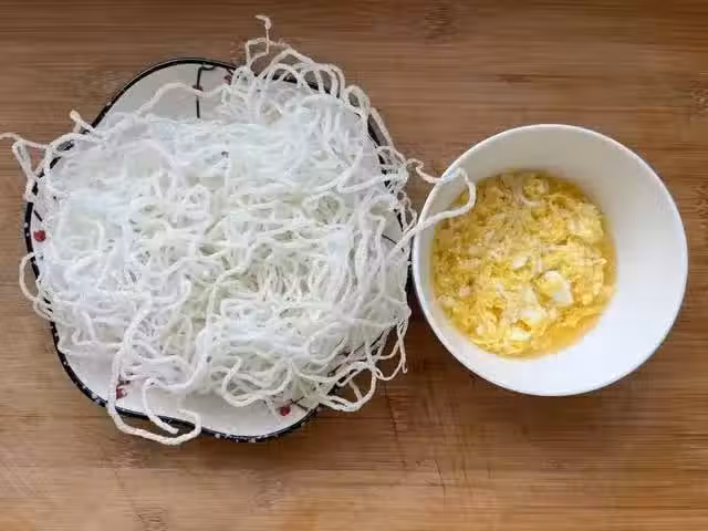 3、手上戴一次性手套,把炸好的龍口粉絲捏碎放入菠菜內,炒好的雞蛋碎也倒進去,接下來就是調餡,往菜餡內倒入1勺蚝油、少許味極鮮、少許雞精、鹽和幾滴香油用筷子充分的攪拌均勻即可。
