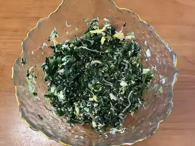 4、提前用冷水和一個軟一些的麵糰,放一旁醒發十分鐘,菜餡和好後,把麵糰取出來揉一會再分成小面劑子,最後揉搓成長條,切成餃子劑子,摁壓好後擀成圓潤的餃子皮,餃子皮內放入適量的菜餡,可根據自己的手法包成好看的餃子就可以。