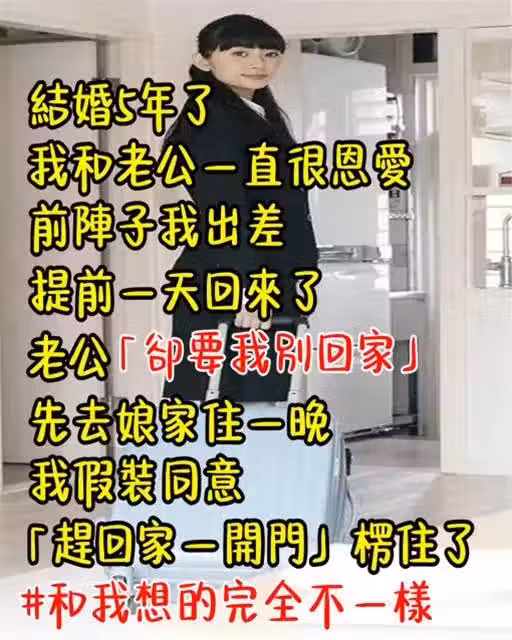 結婚5年,我和老公一直很恩愛。我出差提前一天回來了,老公「卻要我別回家」先去娘家住一晚,我假裝同意「趕回家一開門」愣住了… fav543.com