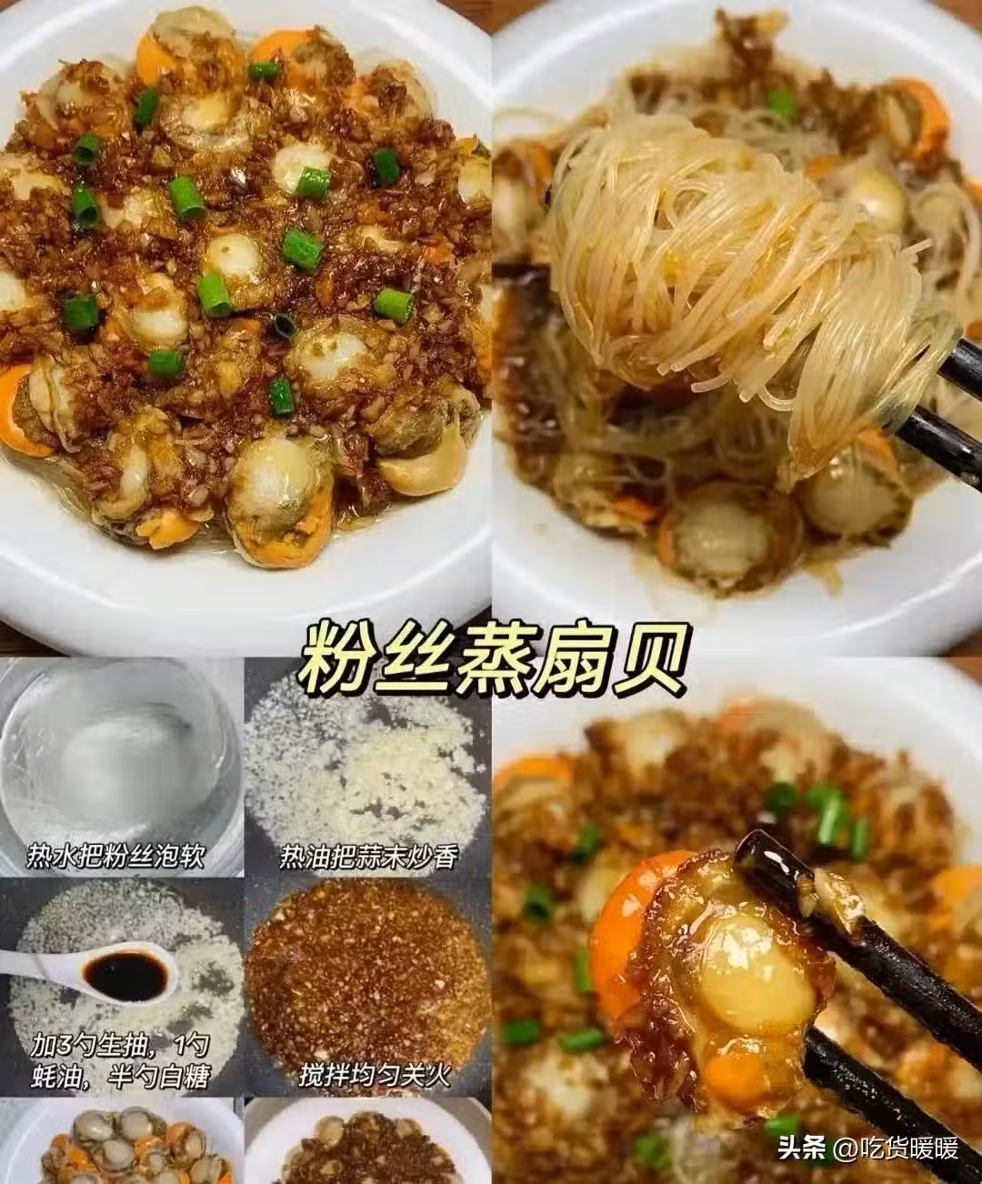 熱水把粉絲泡軟 熱油把蒜末炒香 加3勺生抽,1勺蚝油,半勺白糖 攪拌均勻關火 底下鋪粉絲 倒入調好的醬汁 上面擺上扇貝 大火蒸12分鐘。