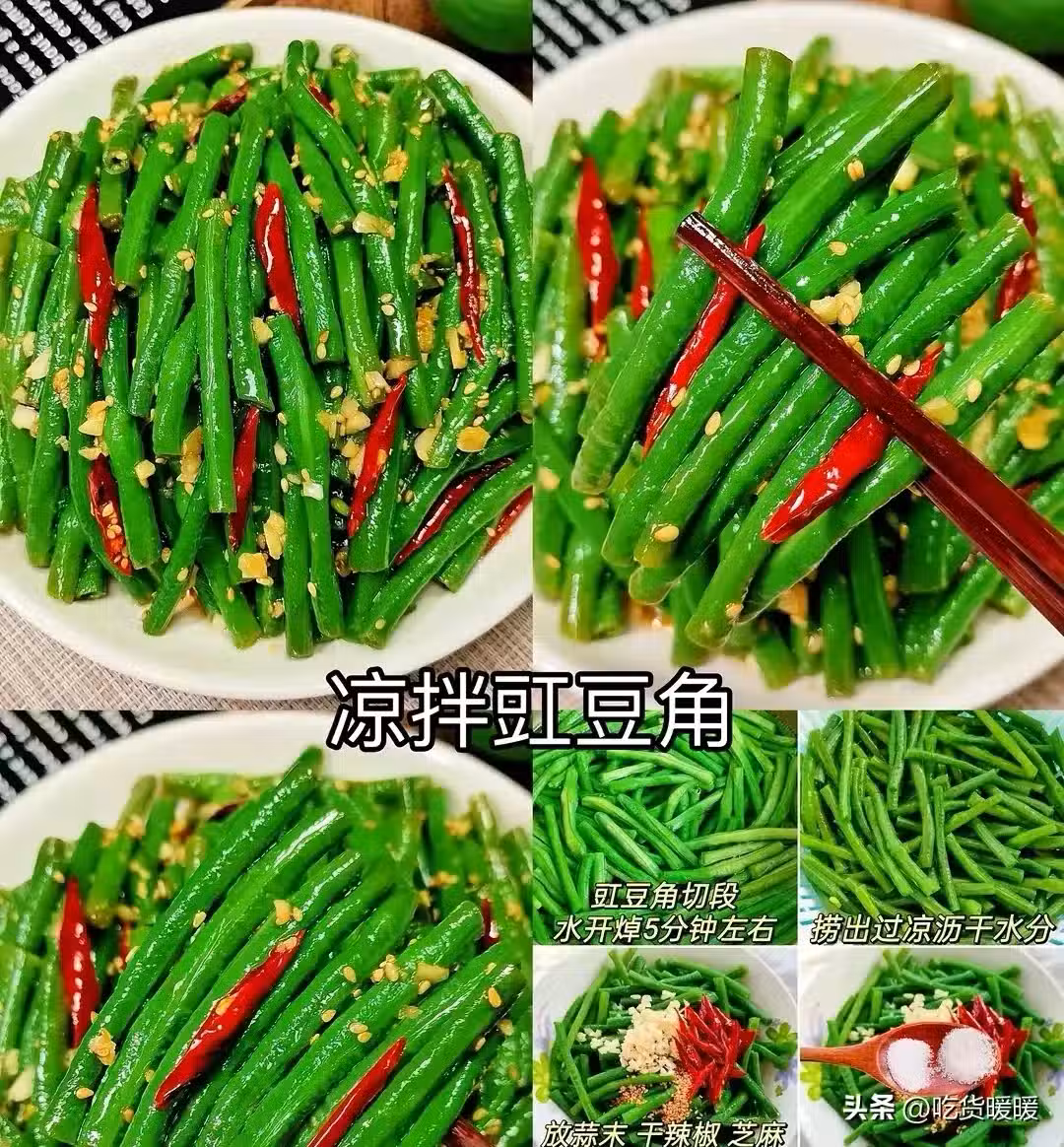 豇豆角切段水開焯5分鐘左右 撈出過涼瀝干水分 放蒜末 干辣椒芝麻淋適量熱油 加少許鹽糖 3勺生抽 1勺香醋拌勻即可。