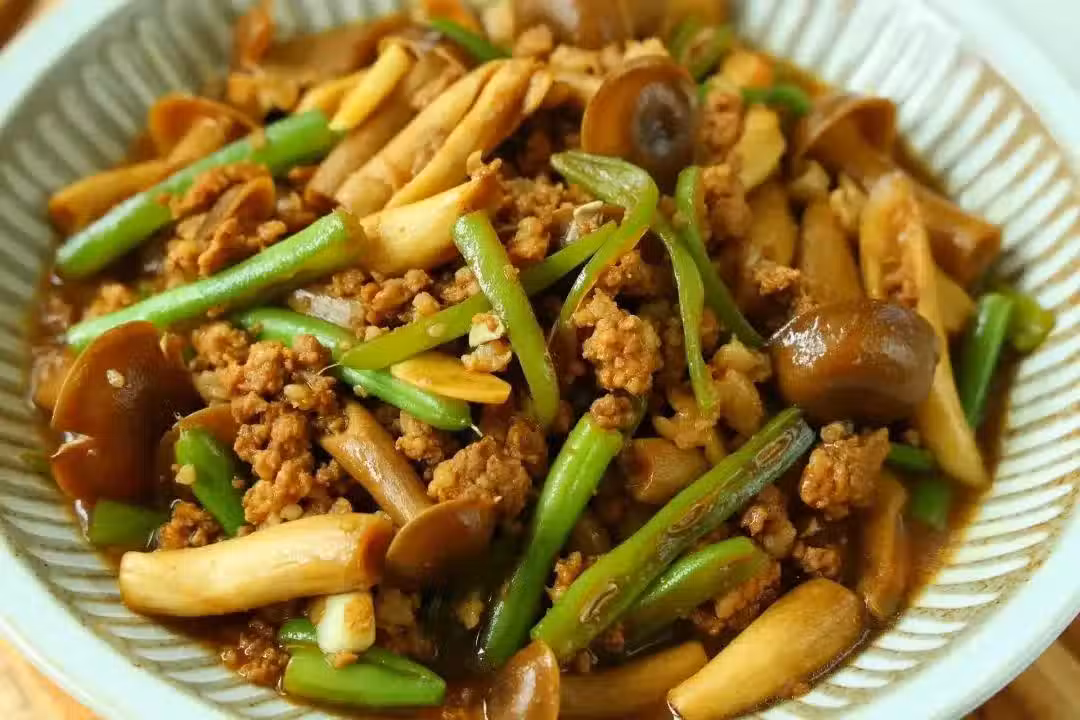 製作配料:菌菇1盒 豆角1把 肉末200克 生抽2勺 老抽1勺 鹽1勺 白鬍椒粉少量 大蒜2個 生薑1片 水澱粉少量