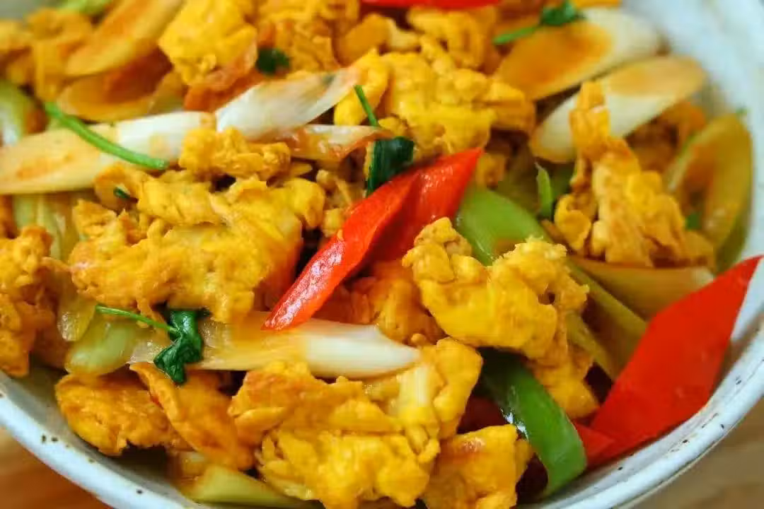 一盤精心烹飪的大蔥爆炒鵝蛋,如同一幅生動的畫卷展現在眼前。金黃色的鵝蛋碎塊,在燈光下閃耀著誘人的光澤;翠綠的大蔥段與鮮紅的紅椒片交織其間,色彩對比鮮明,讓人一眼便能感受到食材的新鮮與活力。這樣的配色,不僅激發了食慾,更賦予了這道菜極高的顏值,讓人在品嘗之前就已心生歡喜。