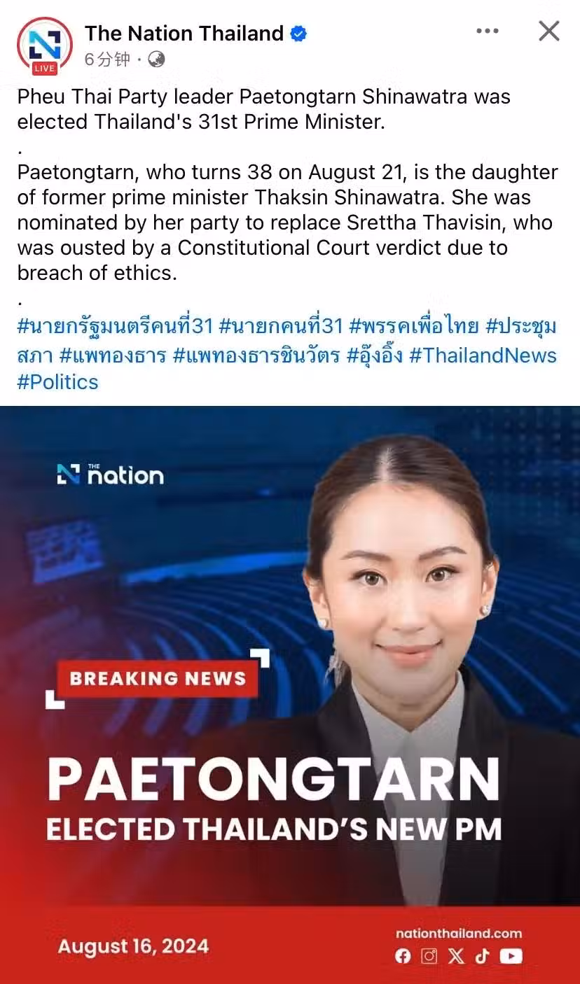 巴東丹西那瓦(Paetongtarn Shinawatra),泰國前總理他信的小女兒、為泰黨的領袖、兩個孩子的母親。 以上三個頭銜,是介紹她時最常用的說法。但是,從今天起這三個頭銜都要往後靠靠了。 就在剛剛,她成功登頂職業巔峰——獲選第31任泰國總理,成為了泰國歷史上最年輕
