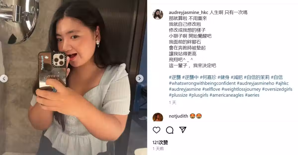 前日(14日)何嘉珍在分享了幾張運動後的香汗淋漓的照片,留言表示:「人生啊,只有一次嗎?那就算啦,不用重來,我就自己修改啦!修改成我想的樣子。小獅子啊!開始覺醒吧!我面前的絆腳石會在奔跑時被墊起,讓我站得更高 飛翔吧。這一輩子,我來決定吧。」並帶上逆襲、自信、減肥等話題。