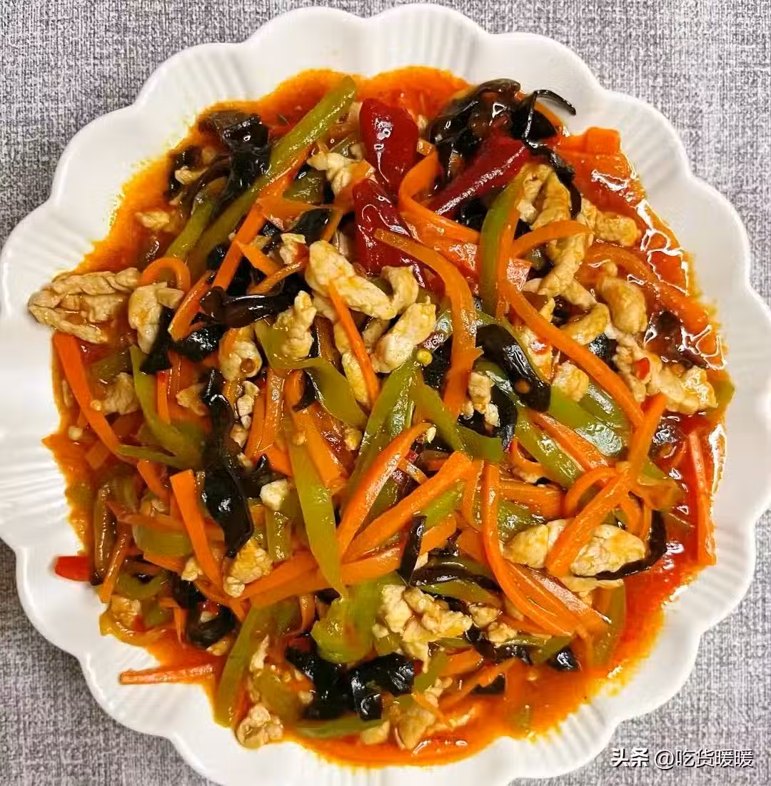 肉絲:半勺料酒、食材:青椒、木耳、 1勺生抽、半勺澱粉抓勻胡蘿蔔蔥蒜末 腌制5分鐘 豆瓣醬炒出紅油 胡蘿蔔絲、木耳翻炒斷生