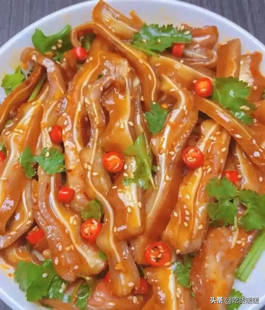 辣椒粉、芝麻 8淋上熱油 放豬耳朵 煮至30分鐘 2勺生抽 2勺醋 ,撈出切片 倒醬汁 香菜拌勻 1勺蚝油。