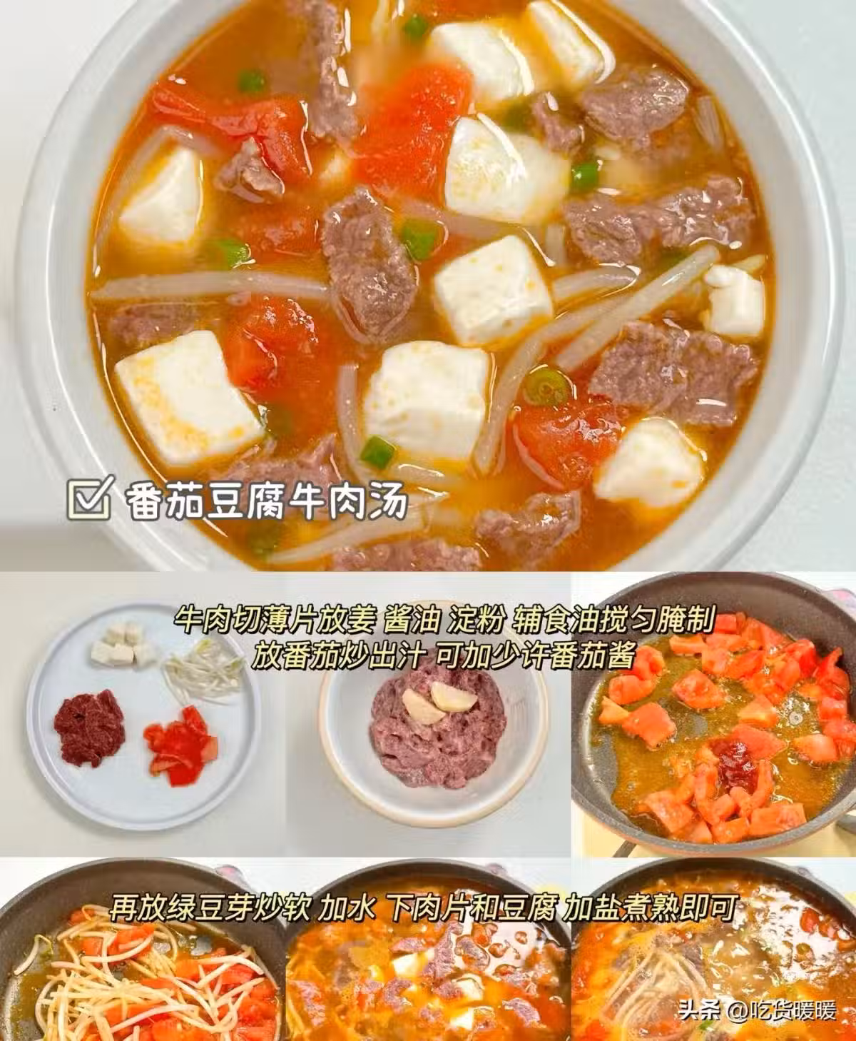 牛肉切薄片放姜 醬油 澱粉輔食油攪勻腌制放番茄炒出汁可加少許番茄醬再放綠豆芽炒軟 加水 下肉片和豆腐加鹽煮熟即可