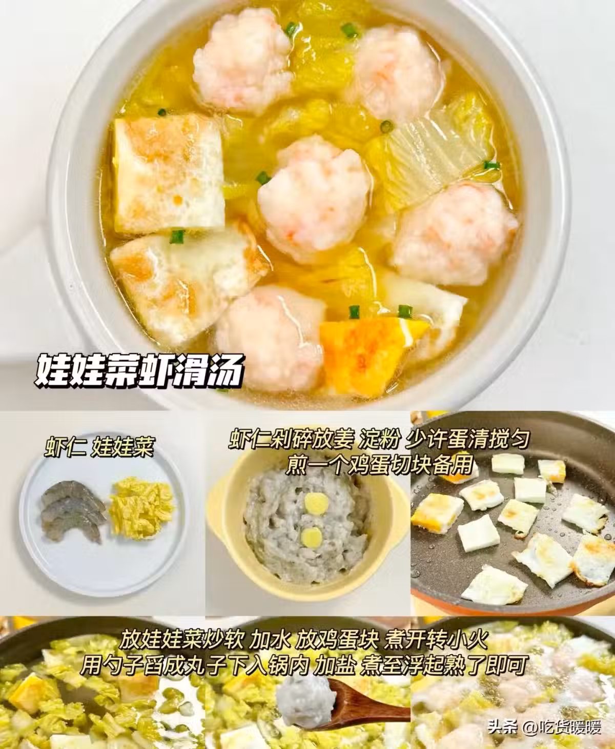 蝦仁娃娃菜 蝦仁剁碎放姜 澱粉少許蛋清攪勻 煎一個雞蛋切塊備用放娃娃菜炒軟 加水 放雞蛋塊煮開轉小火用勺子舀成丸子下入鍋內 加鹽 煮至浮起熟了即可。