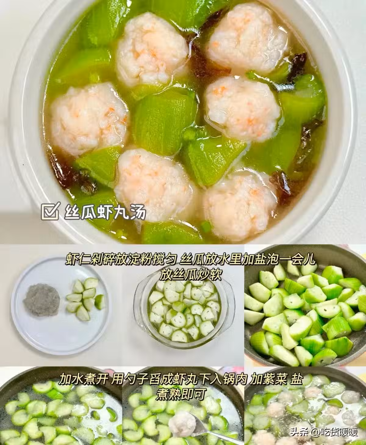 蝦仁剁碎放澱粉攪勻 絲瓜放水裡加鹽泡一會兒放絲瓜炒軟加水煮開 用勺子舀成蝦丸下入鍋內加紫菜鹽煮熟即可。