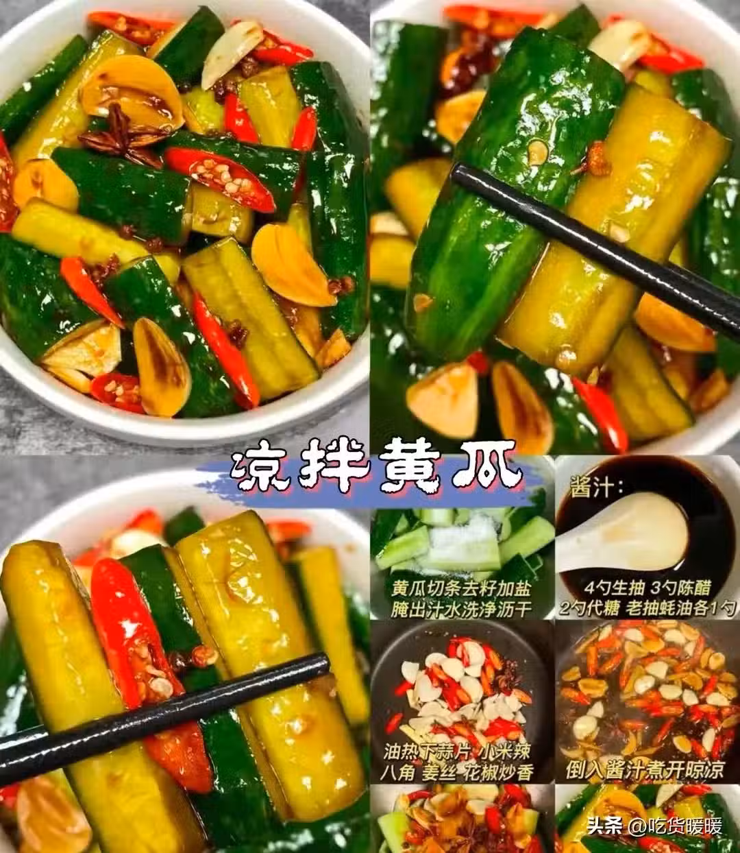 黃瓜切條去籽加鹽 4勺生抽 3勺陳醋 腌出汁水洗凈瀝干 2勺代糖 老抽蚝油各1勺 油熱下蒜片小米辣八角 薑絲 花椒炒香 倒入醬汁煮開晾涼 黃瓜淋上醬沙 腌制2小時 完成 。