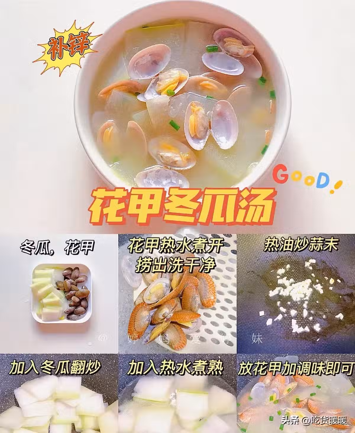 冬瓜,花甲 花甲熱水煮開 熱油炒蒜末 撈出洗乾淨加入冬瓜翻炒 加入熱水煮熟 放花甲加調味即可。