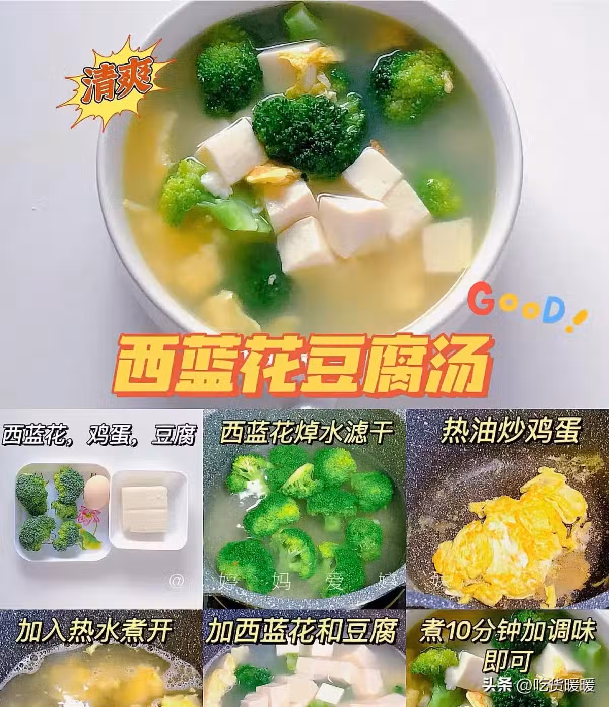 西藍花,雞蛋,豆腐 西藍花焯水濾干 熱油炒雞蛋加入熱水煮開 加西藍花和豆腐 煮10分鐘加調味 即可。