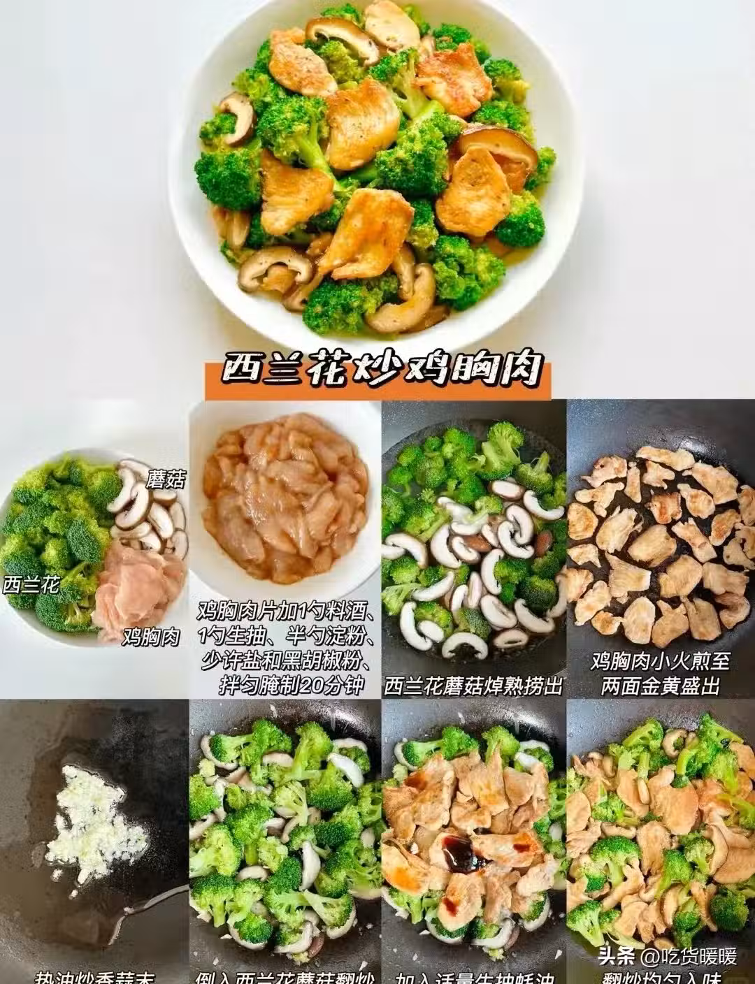 加1勺料酒、雞胸肉1勺生抽、半勺澱粉、少許鹽和黑胡椒粉、 雞胸肉小火煎至, 拌勻腌制20分鐘 ,西蘭花蘑菇焯熟撈出 ,兩面金黃盛出。 熱油炒香蒜末, 倒入西蘭花蘑菇翻炒 ,加入適量生抽蚝油 ,翻炒均勻入味。