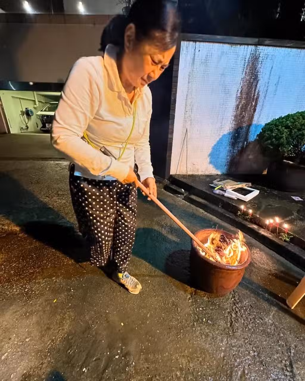 汪明荃公開的兩張照片,估計是在豪宅外空地進行燒衣,汪明荃打扮隨性,穿上長袖衫襯圓點褲,紮起頭髮,站在鐵桶旁燒火,而旁邊的地上放有香燭冥鏹。