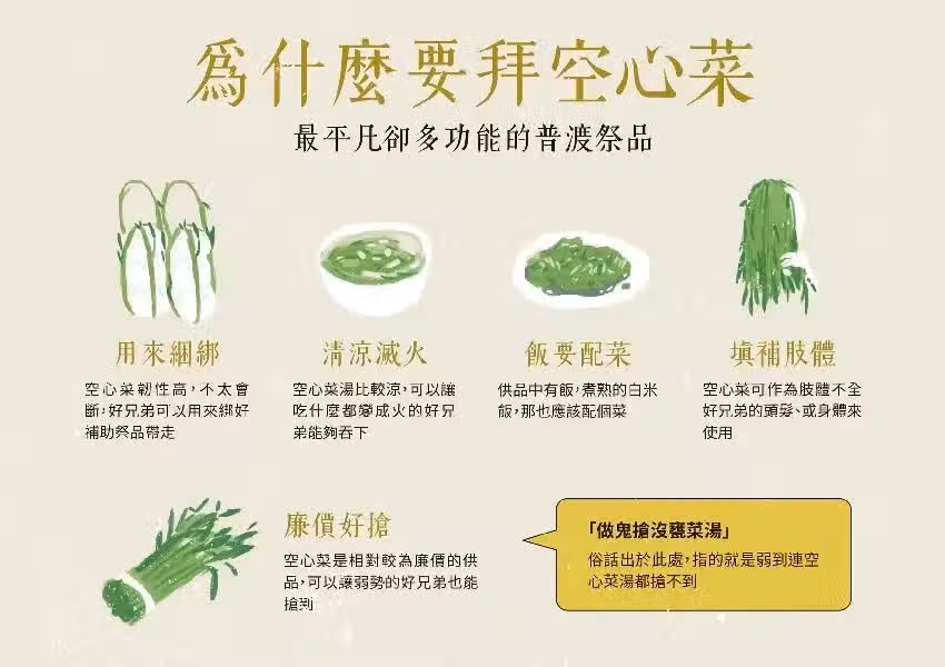 這名資深網友表示空心菜其實是功能滿滿的超值祭品,鄰居阿伯可不是亂燒一通的!堅韌的菜梗可以讓好兄弟用來打包外帶其他供品,空心菜也屬於偏廉價的菜肴,可以讓比較弱勢的好兄弟也搶到,使普渡儀式圓滿周到,看完解答也讓網友紛紛直呼「長知識了」,果然姜還是老的辣,拜拜高手就是阿伯!圖片來源:文化銀行 Bank of Culture FB