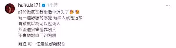 賴慧如還在帖子中控訴這個人只會一味地怪罪別人,不會檢討自己是否有問題,她甚至直接指出:「難怪,每一任最後都離開你。」