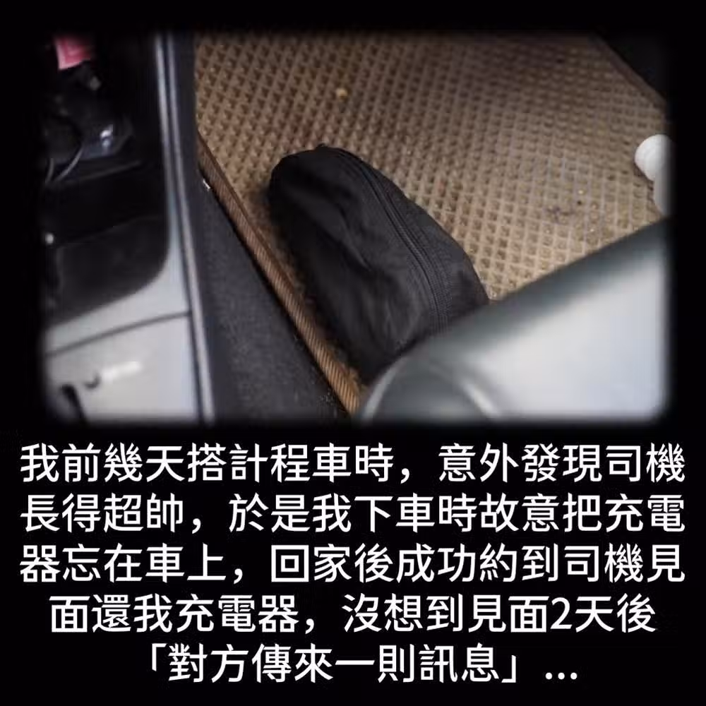 我前幾天搭計程車時,意外發現司機長得超帥,於是我下車時故意把充電器忘在車上,回家後成功約到司機見面還我充電器,沒想到見面2天後「對方傳來一則訊息」...