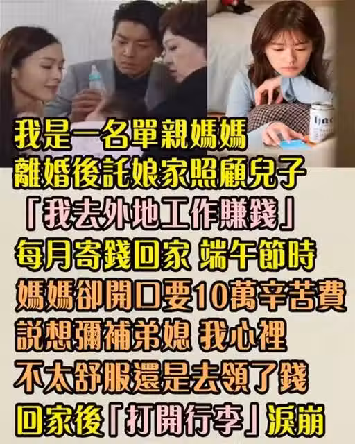 我是單親媽媽,失婚後托娘家照顧兒子「 我去外地工作賺錢 」每月寄錢回家! 端午節時「媽媽卻開口要10萬辛苦費」說想彌補弟媳…我心裡不太舒服還是去領了錢,回家後「打開行李」淚崩