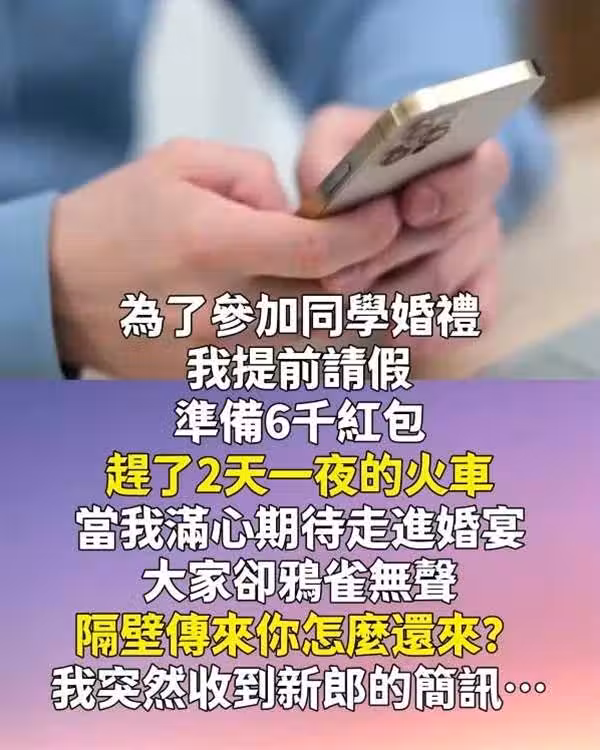 為了參加同學婚禮,我提前請假,準備6千紅包,趕了2天一夜的火車,當我滿心期待走進婚宴,大家卻鴉雀無聲,隔壁傳來「你怎麼還來?」我突然收到新郎的簡訊!!