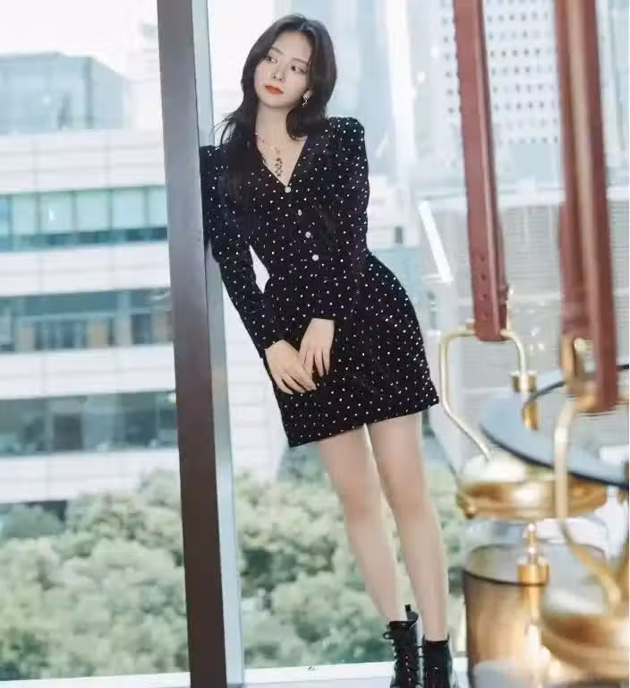 譚松韻徹底改變了,,身穿黑色滿天星連衣裙大秀少婦風姿!