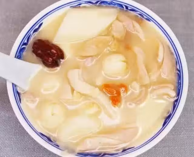 6、加入蓮子、山藥和大棗,繼續中小火煮半小時。最後加入枸杞和少許鹽,小火燉十分鐘即可。