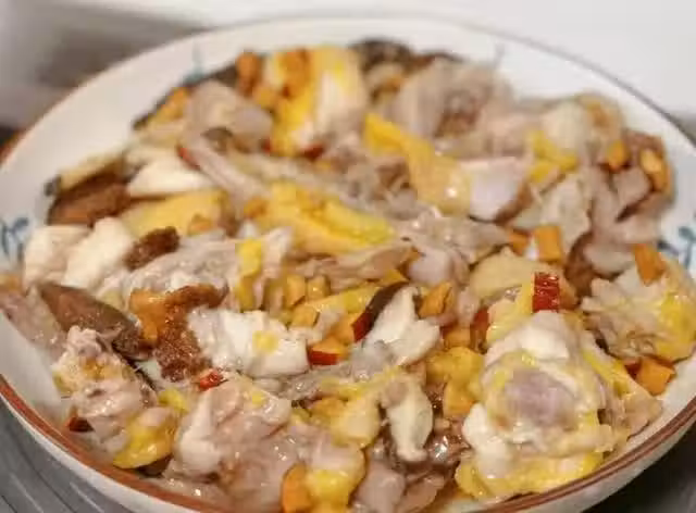 2、雞砍塊腌制,用鹽糖、白鬍椒粉、蚝油、生粉充分抓入味,加入香菇、羊肚菌和紅棗粒,最後用花生油封住水分,大火蒸20分鐘即可出鍋。