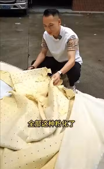 他更即場親自拆毒床,把床褥解剖後,即見床褥不單冒出大量灰塵,更見一層層泛黃的物料,唯一一層的乳膠也碎裂。
