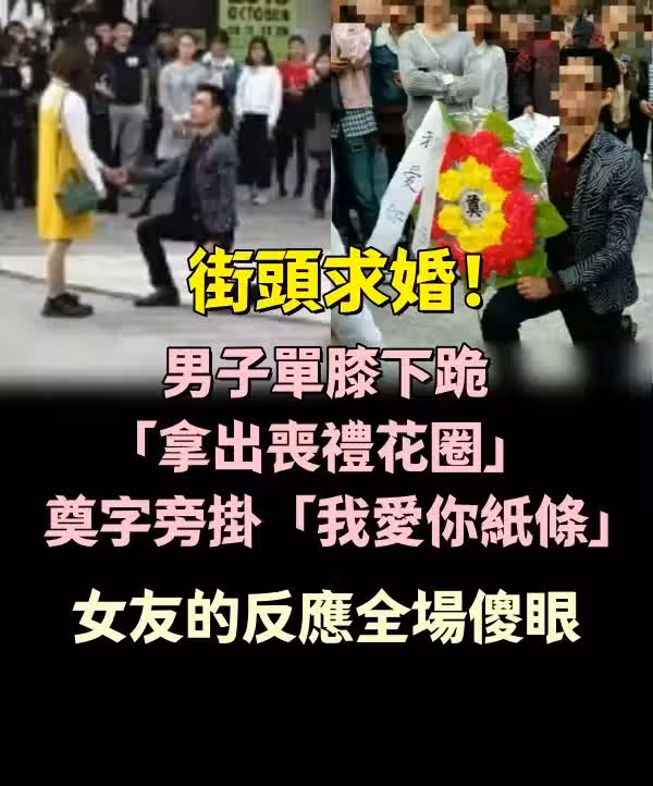 街頭求婚!男子單膝下跪「拿出喪禮花圈」 奠字旁掛「我愛你紙條」女友的反應全場傻眼
