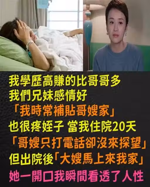 我學歷高賺的比哥哥多! 我們兄妹感情好「我時常補貼哥嫂家」也疼侄子,當我住院20天「哥嫂只打電話卻沒來探望」....但出院後「大嫂馬上來我家」她一開口我瞬間看透了人性