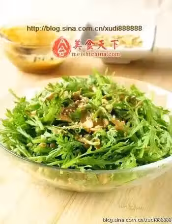 4、蓬蒿菜裝盆,撒上花生碎,淋入麻醬汁即可。
