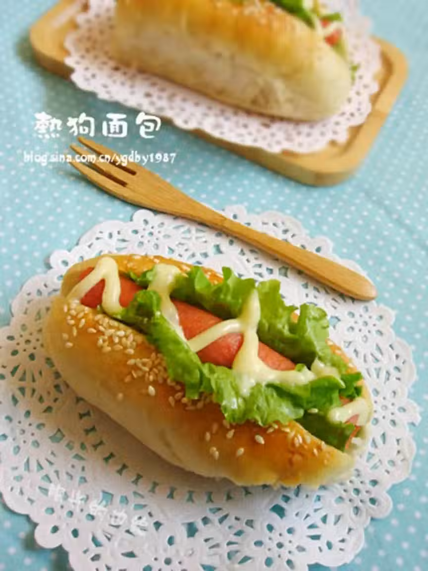 【熱狗麵包】 -材料:高粉250g(金像B),細砂糖12.5g,酵母6g,鹽4g,水162.5g,玉米油12.5g,脫皮白芝麻適量 -配料:沙拉醬,素火腿腸,生菜。 -做法:1、麵包胚的所有材料一起倒入面盆,揉至擴展,放置溫暖處發酵至2倍大。 2、排氣,分割成6份或8份,滾圓,中間發酵15分鐘。 3、再次排氣,逐個擀開,整形成橄欖形,放在溫暖的地方進行最後發酵。 4、待麵糰發酵至兩倍大的時候,表面噴水,烤箱預熱180度上下火18-20分鐘。 5、麵包出爐後,可以接著烤素腸,刷一層油,180度10分鐘即可。 6、烤好的麵包最好趁熱刷上一層食用油,待冷卻後用刀從中間拋開,不要切斷,夾上生菜和烤過的素腸,淋上醬料即可。(我擠的沙拉醬太難看啦啦) -P.S.:熱狗的醬料可以是沙拉醬也可以番茄醬,也可以是你喜歡的任何醬料,自由發揮啦。以後我會陸續發一些素沙拉醬的做法。這個麵包最好趁熱吃,熱吃最美味哦~
