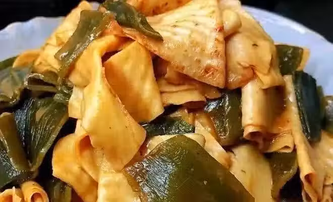 食材:海帶一盤,豆皮1.5張,老抽 1勺,白糖半勺,豆瓣醬1勺,鹽適量,八角、桂皮適量