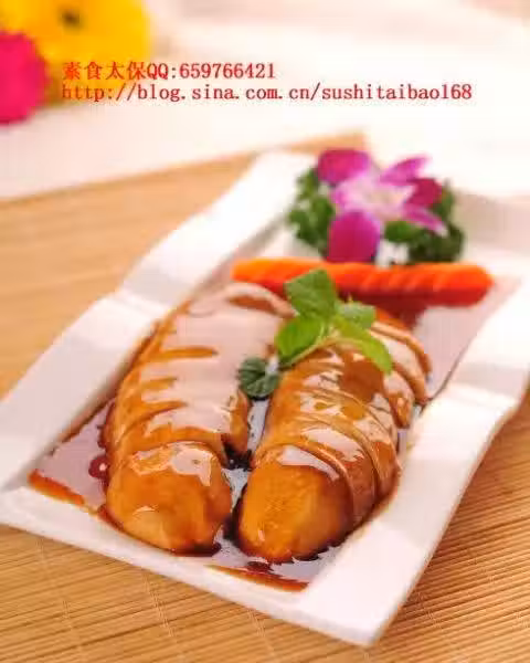 6、另起凈鍋,將滷製鮑菇的滷水汁潷出,鍋中放入少許水,加入少許滷汁,調製成芡汁,出鍋淋在擺排在盤中的鮑菇中即可。