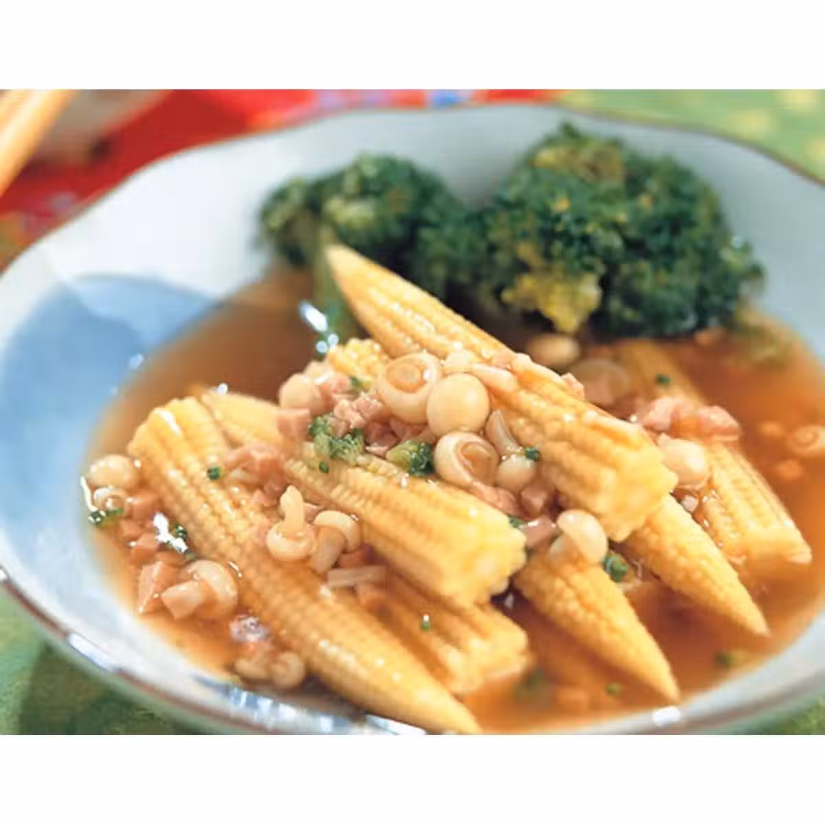 3.另起一鍋,放入調味料a煮開後,放入作法1的金針菇、綠花菜稍微煮一下,再以玉米粉水勾薄芡後起鍋,淋在作法2的玉米筍上即可。