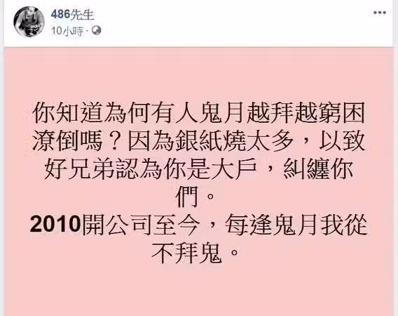 很多好兄弟會以為你是大戶,就緊抓著你不肯走,所以你就走霉運倒楣身體差運勢差,農曆七月要拜可以,但紙錢只要燒一點,或是一點都不燒,拜拜供品不用太多,聽哥的,不會錯。」。