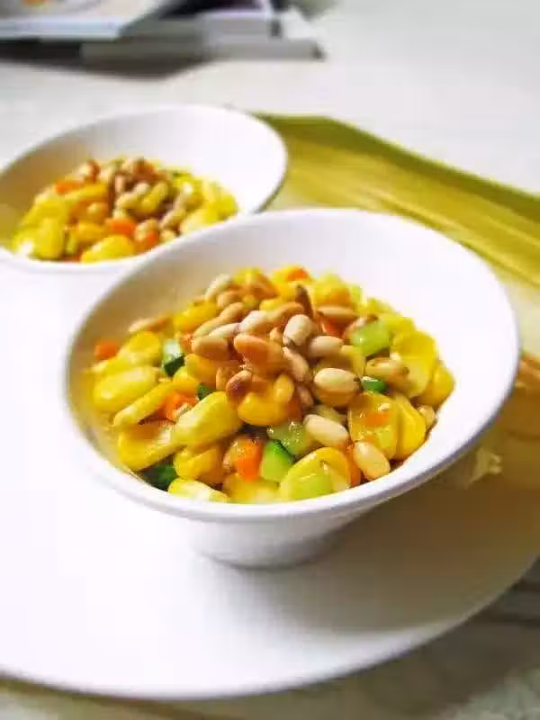 鍋中放少許油,放入玉米,黃瓜丁,胡蘿蔔丁一起翻炒,放入少許鹽、蔬果粉調味,水澱粉勾薄芡,最後撒入炒好的松仁即可。