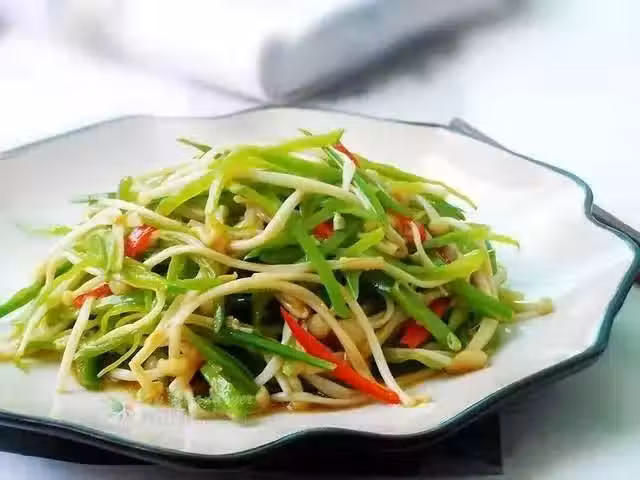 荷蘭豆洗凈去筋切絲,紅椒切絲,生薑切絲,金針菇切去根部洗凈