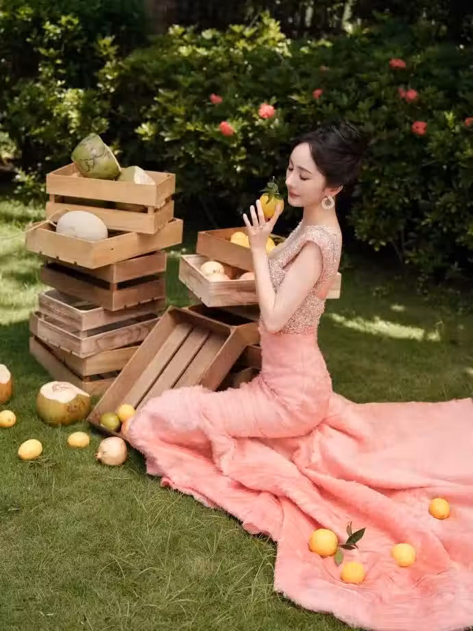大冪冪跪在地上拿著水果擺pose,她閉上雙眼氛圍感拉滿。