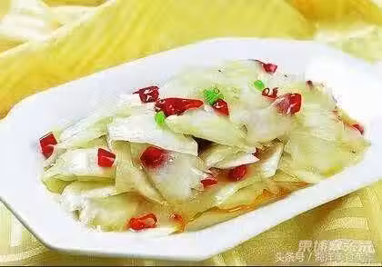 1、大白菜剝去老幫洗凈,在中部切斷分成兩半。把白菜幫這段白菜的根向上立起來,刀與白菜幫成30度角,片切白菜幫,邊切邊轉動白菜,直到全部切好