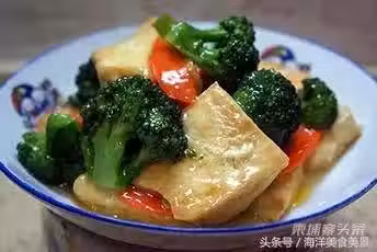 2、起鍋熱油,豆腐用小火煎略黃,盛出備用;西蘭花用滾水焯片刻,撈出,控干水備用。